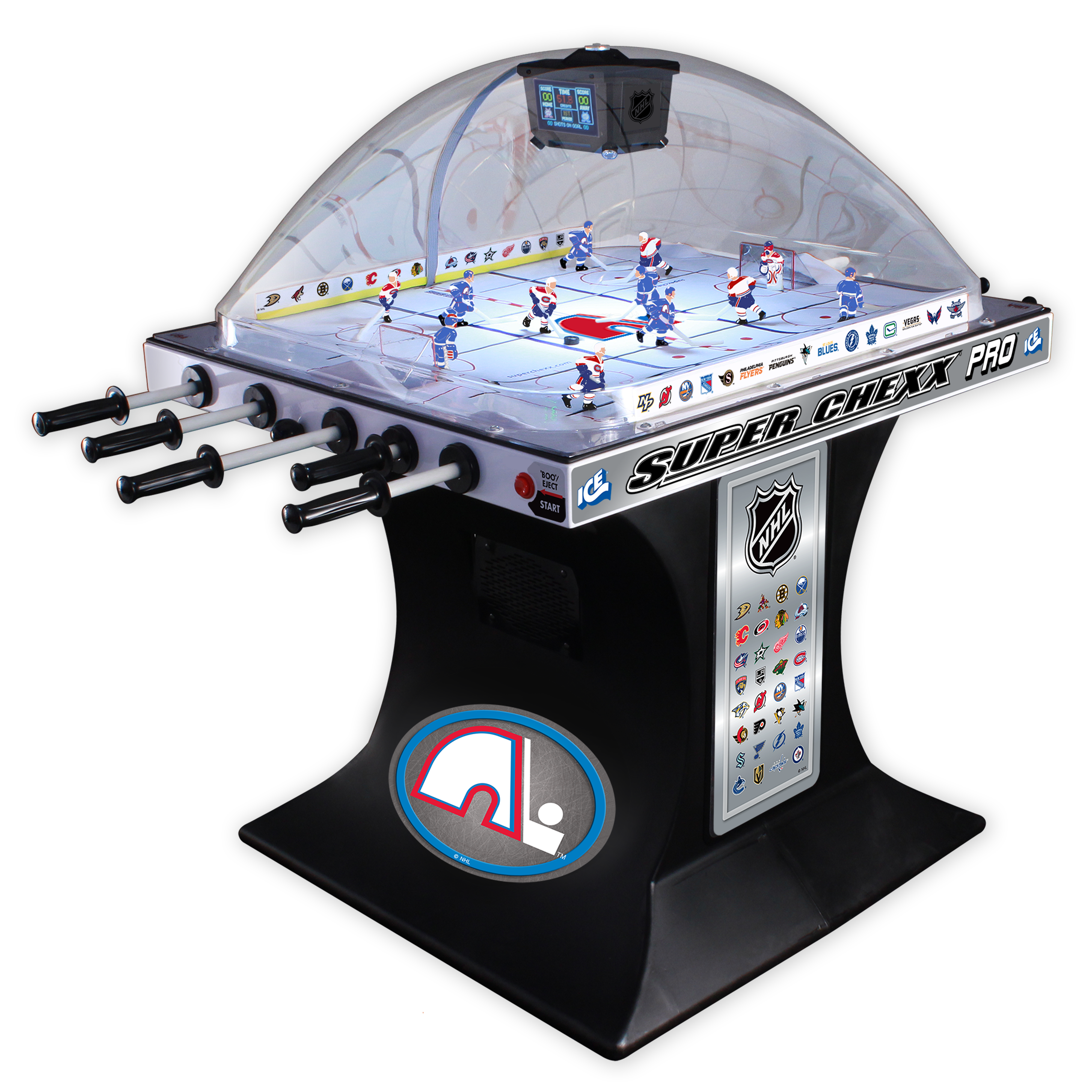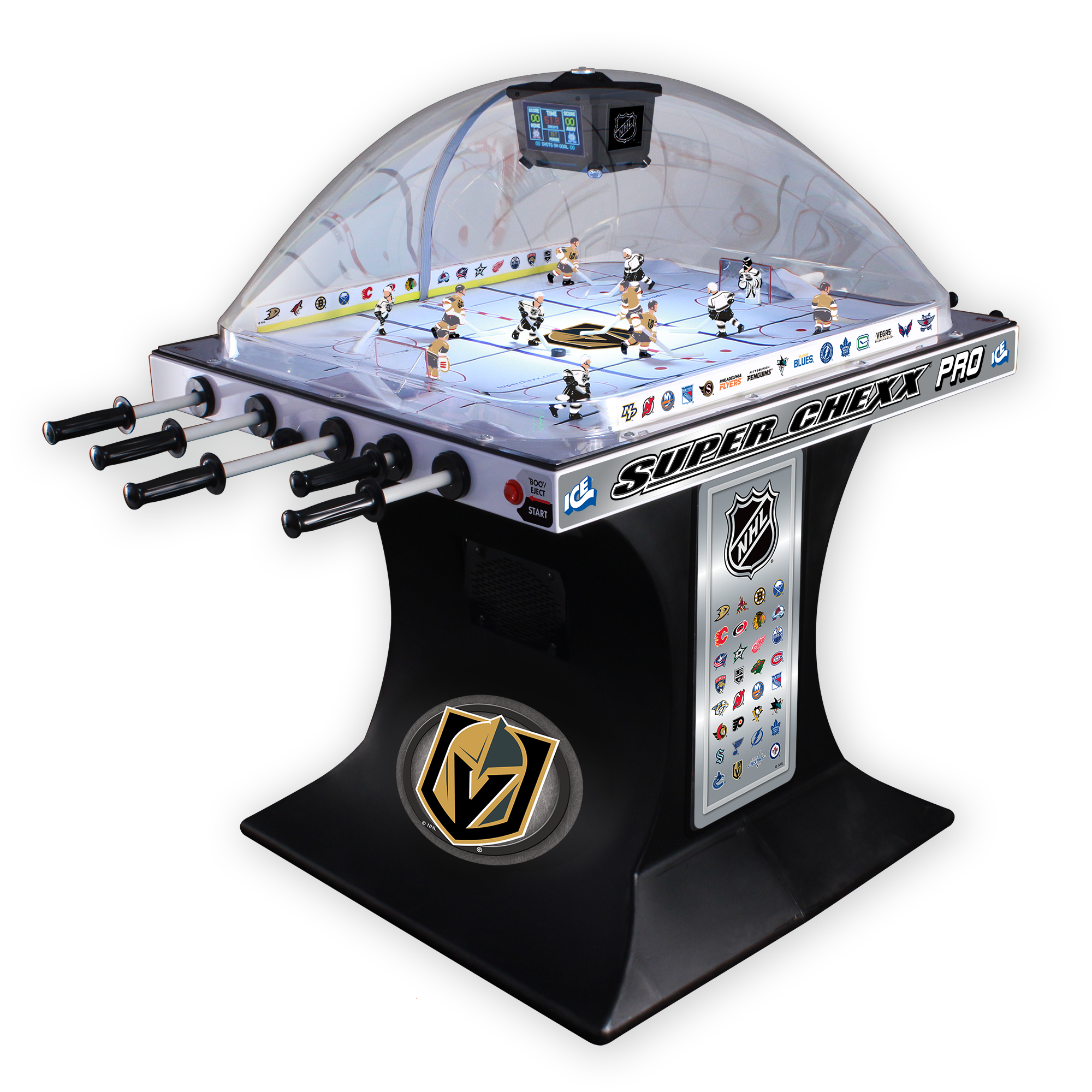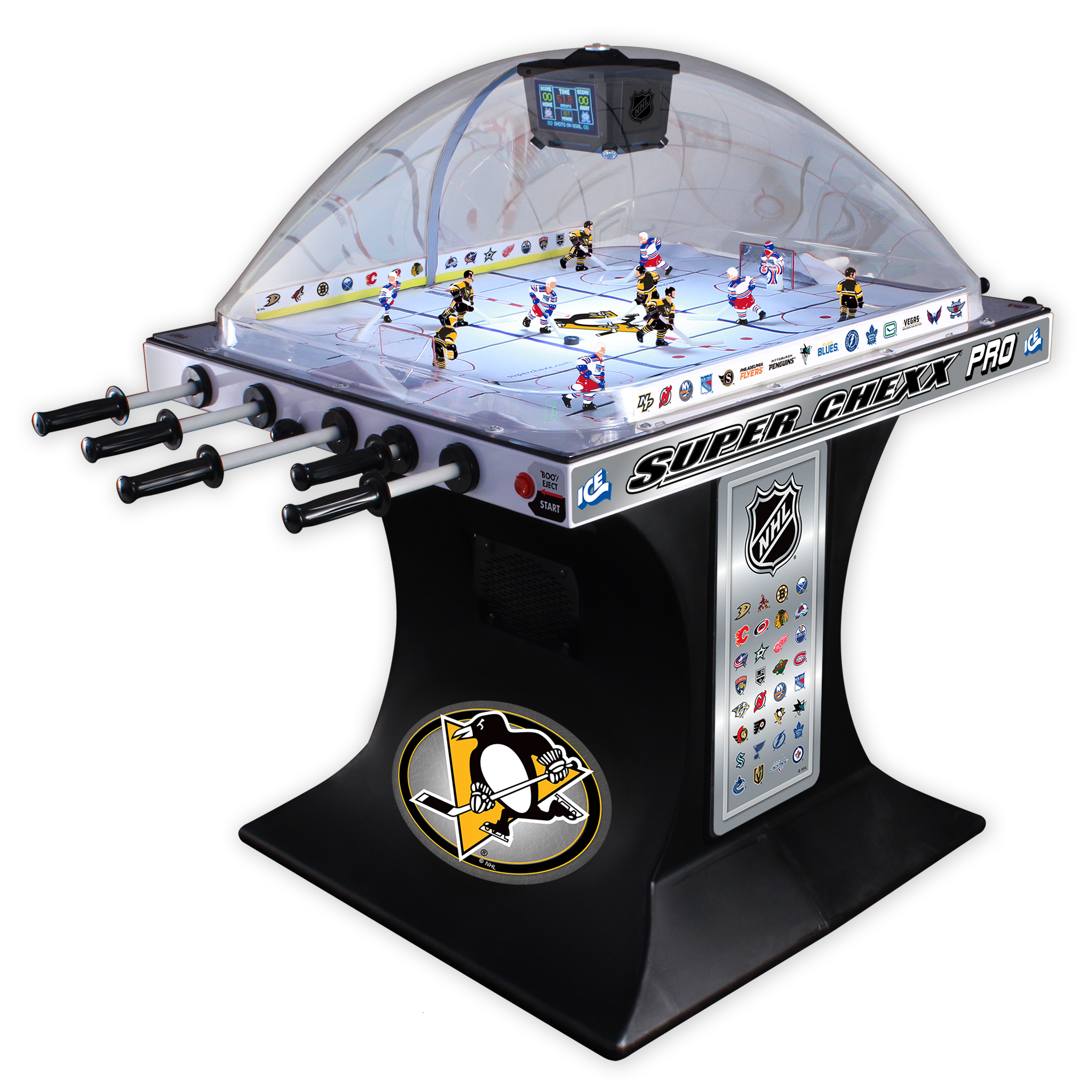 Super Chexx Pro is the only dome hockey brand with electronics that allows for coin-operation. With strong fiberglass, smooth surface material and a durable polyethylene base, this indestructible Bubble Hockey game offers unmatched game play for years to come.